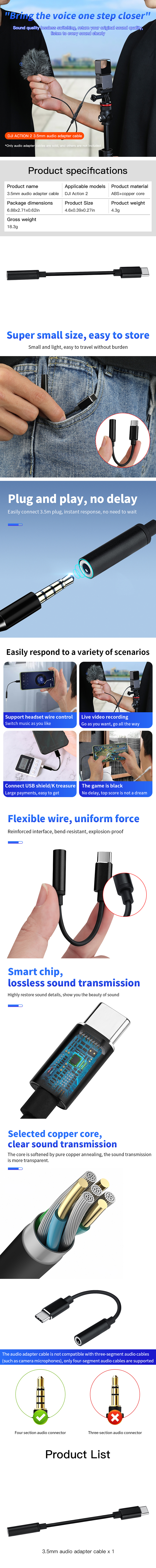 Audio Adapter Cable For DJI Action 2 Type-C to 3.5 Connection Line Interface DAC Digital Chip Adapter Cable Accessory Parts