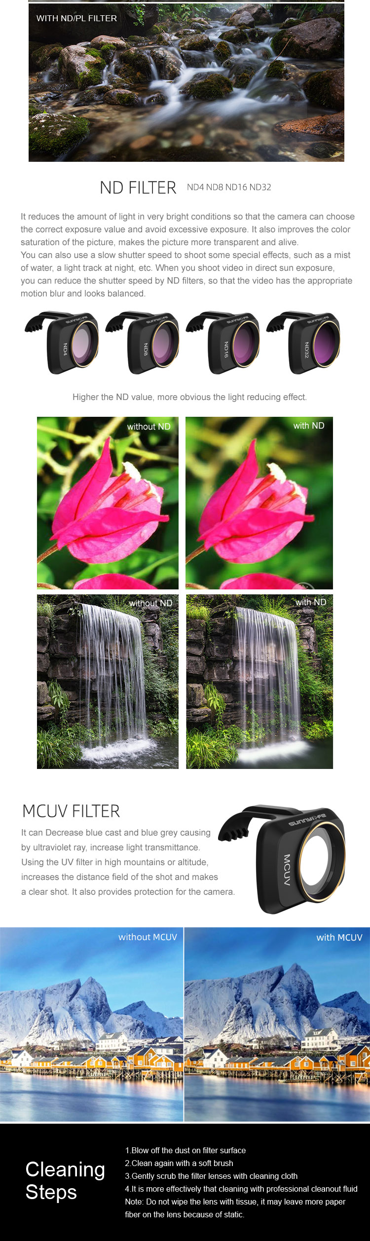 ND16: Higher the ND value, more obvious the light reducing effect.
