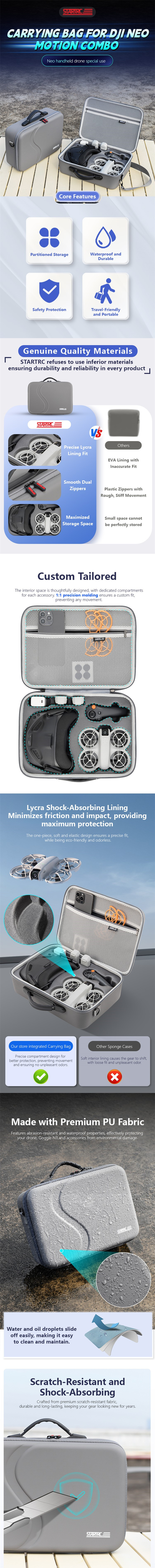 - Carrying bag for DJI NEO motion combo ,Neo handheld drone special use,genuine quality materials,custom tailored,made with premium PU fabric,scratch-resistant and shock-absorbing,impact and drop resistant,Two-in-One crossbody and handheld design.