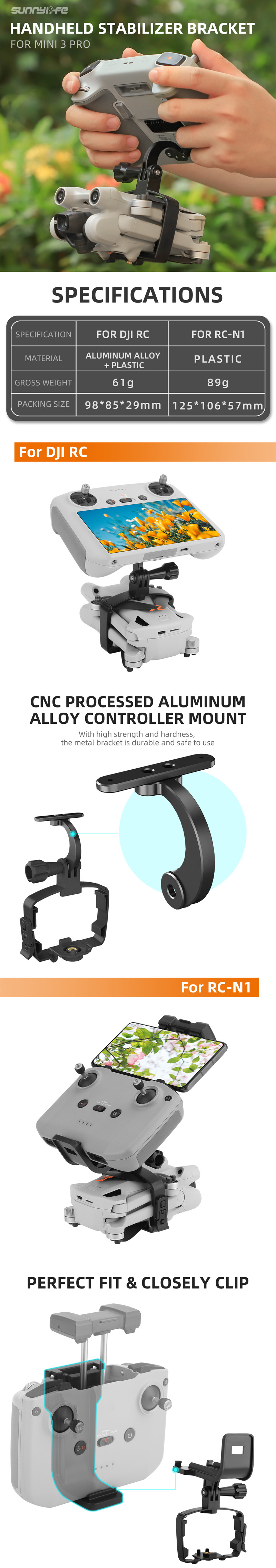 - Controller mount for DJI RC is made of CNC processed aluminum alloy. With high strength and hardness, the metal bracket is durable and safe to use.