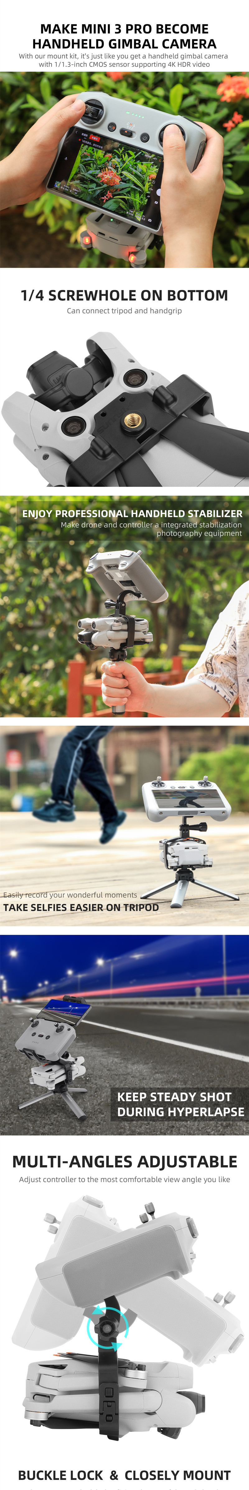 - Make Mini 3 Pro Become Handheld Gimbal Camera. With our mount kit, it's just like you get a handheld gimbal camera with 1/1.3-inch CMOS sensor supporting 4K HDR video.