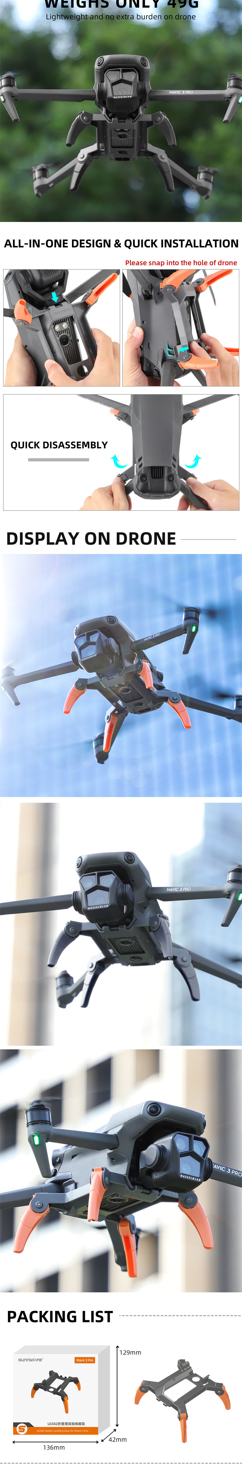 - Spider shape, imperious display, make your royal 3 Pro cool, effective increase 42mm. Increase the spacing between the fuselage and the ground to protect the fuselage, sensors, etc.