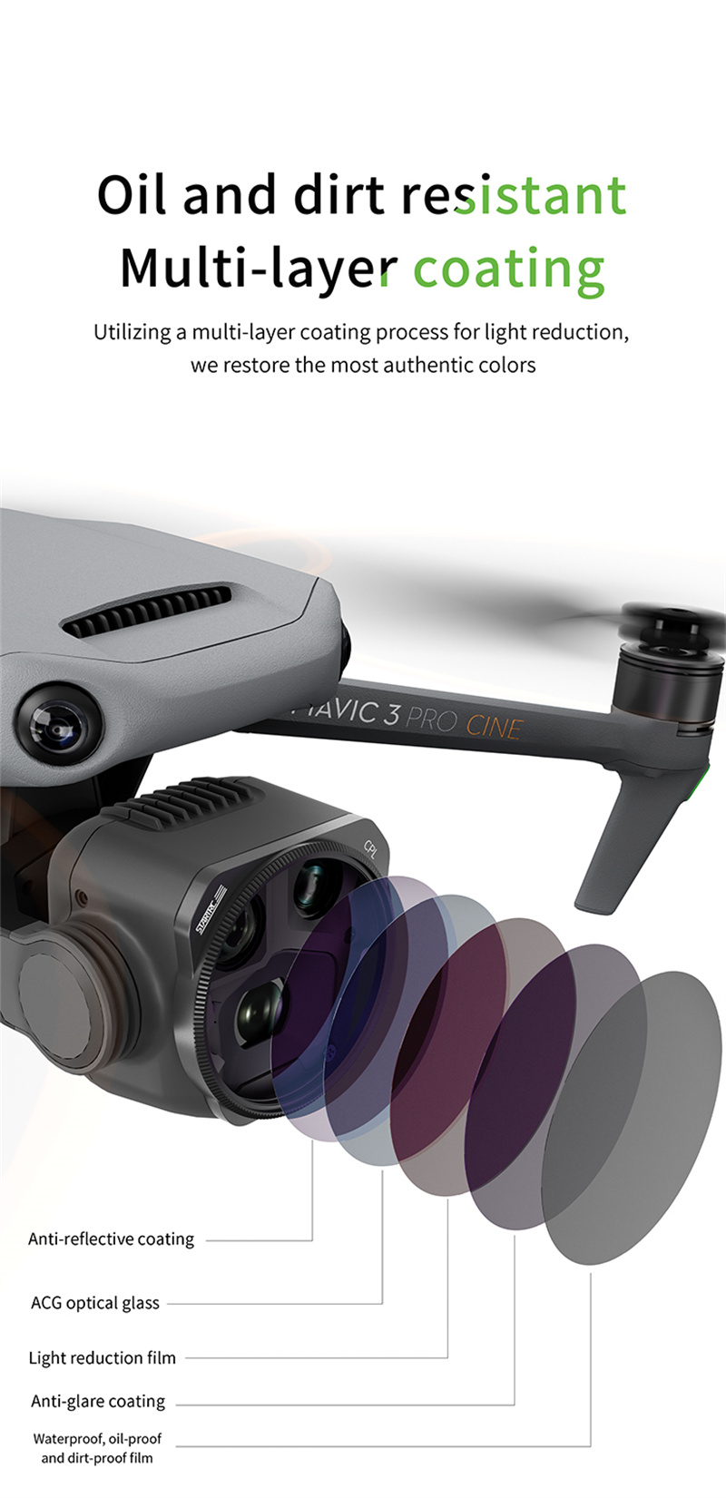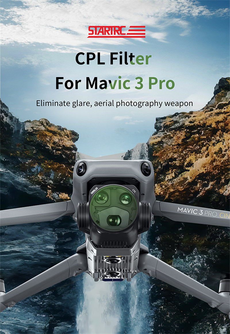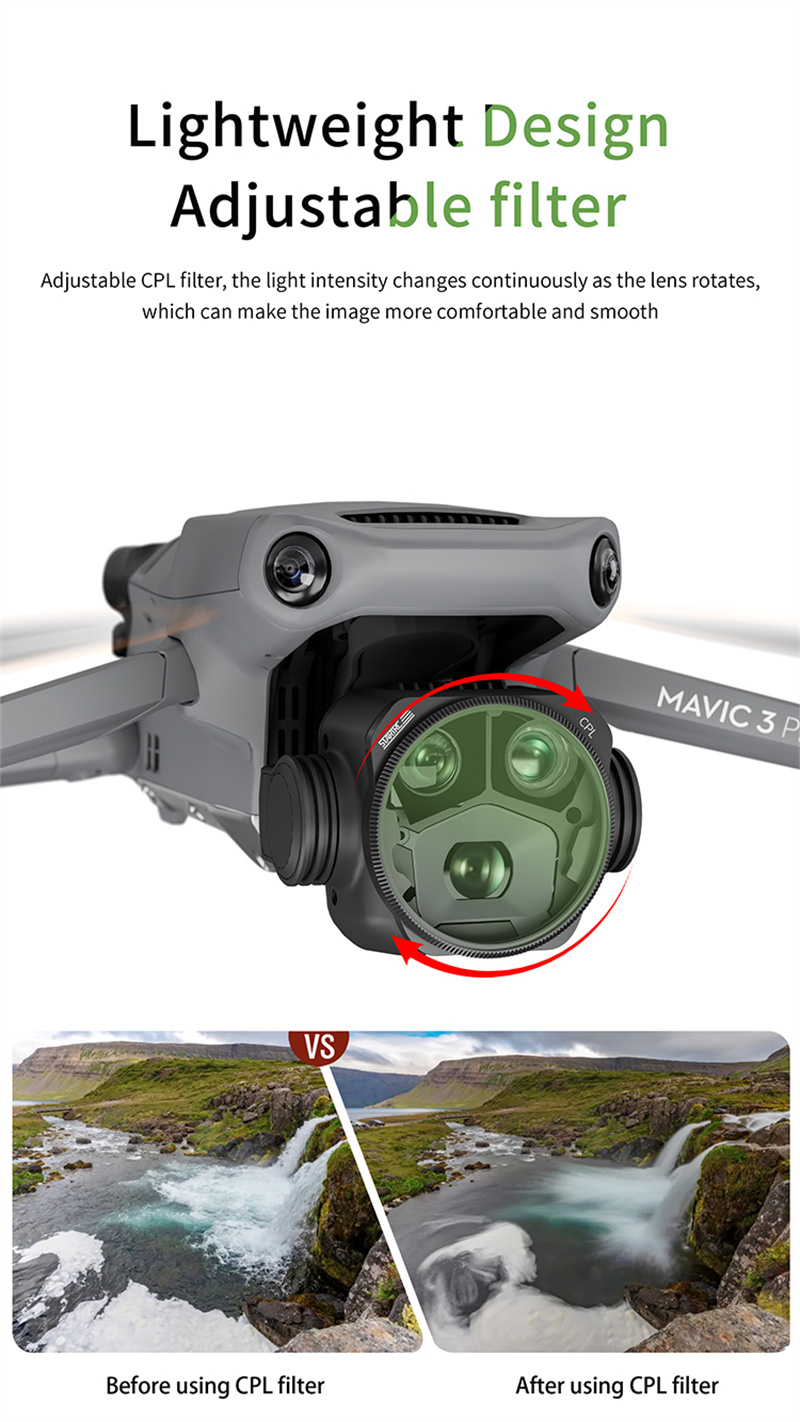 - CPL filters designed specifically for MAVIC 3 Pro drones,Adopting multi-layer coating and dimming process,adjustable filter, the brightness constantly changes with the rotation of the lens, making the picture more comfortable and smooth;