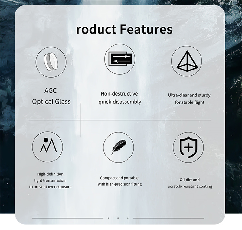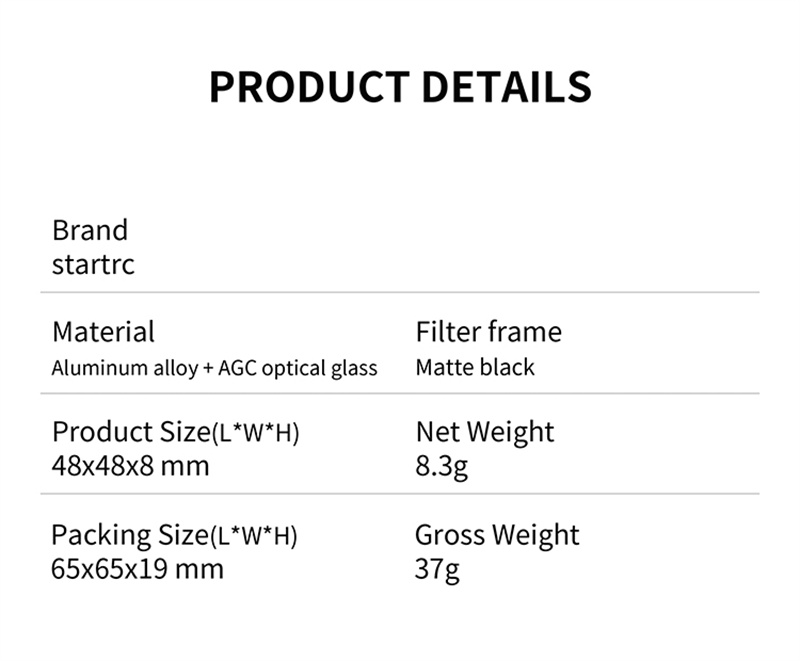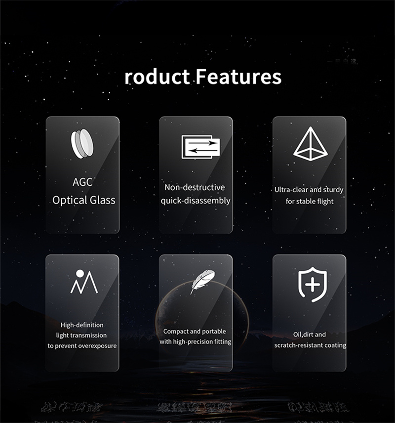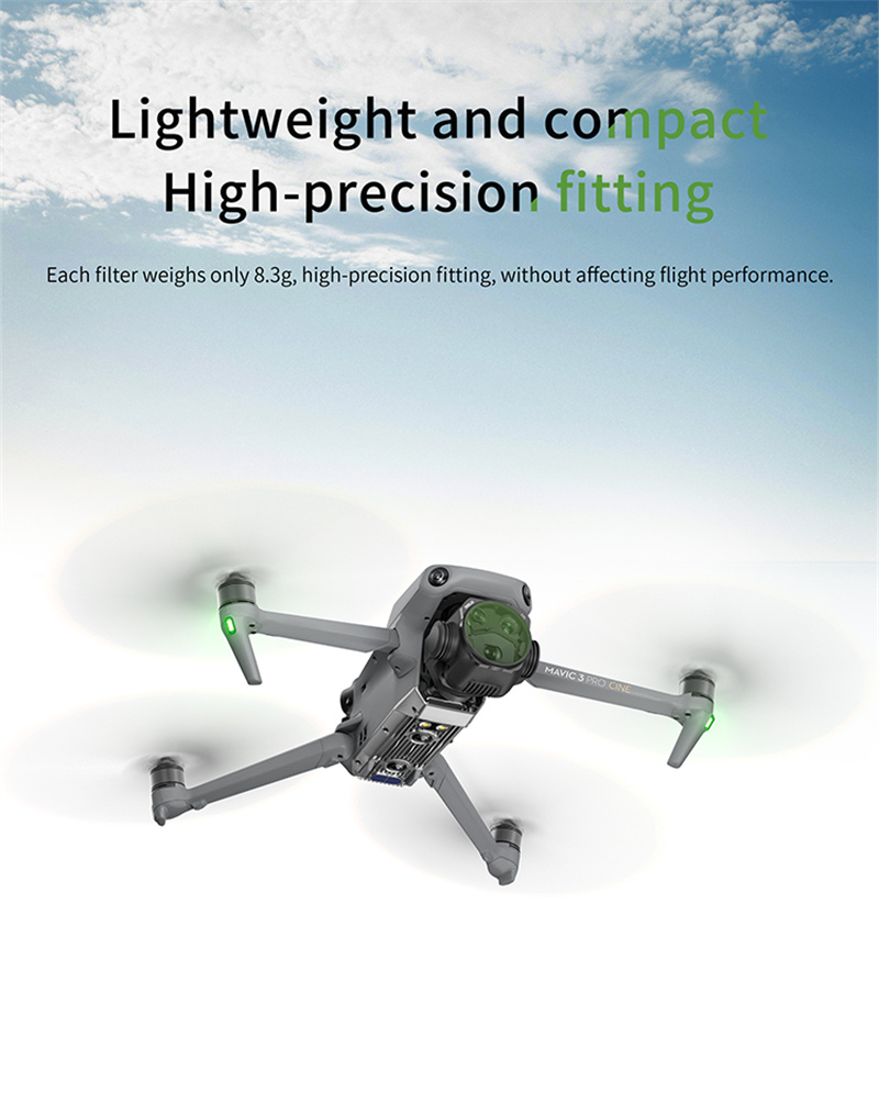 - The snap on design for quick disassembly and assembly,he single weight of the filter is only 8.3G, with high-precision adaptation, which will not affect flight performance;