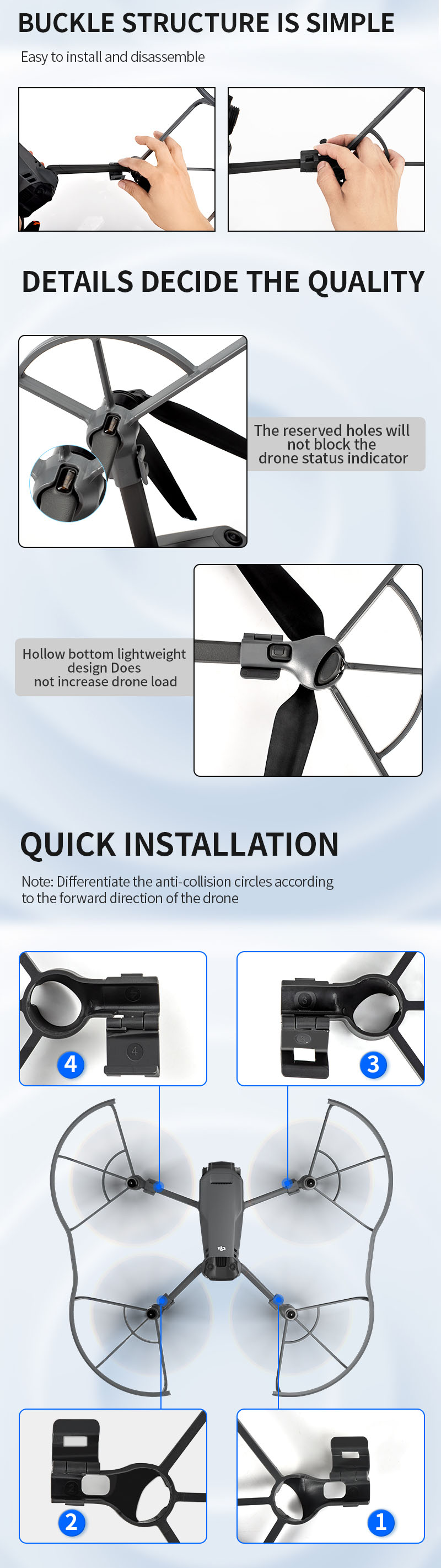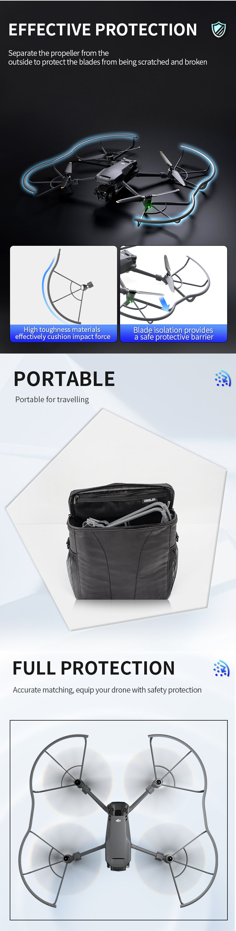 - Propeller Protective Guard protects the propeller from hurting people or objects, making the flight safer.