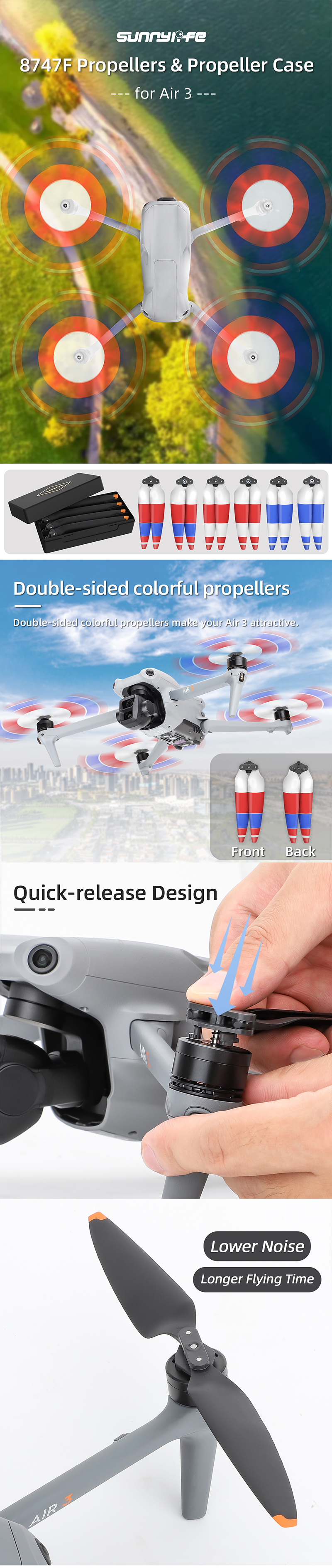 - 8747F Low Noise Propellers for Air 3, Quick-release design, lower noise, longer flying time.