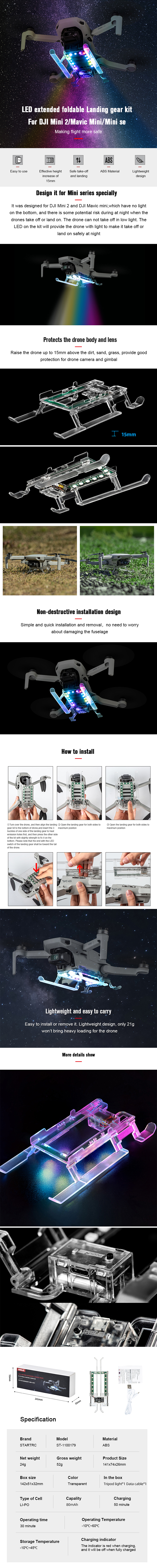 STARTRC For DJI Mavic Mini LED/SE/ Mini 2 Drone Flashing Light Landing Gear Kit Extended Foldable Skid 7-Colors Lamp Accessories