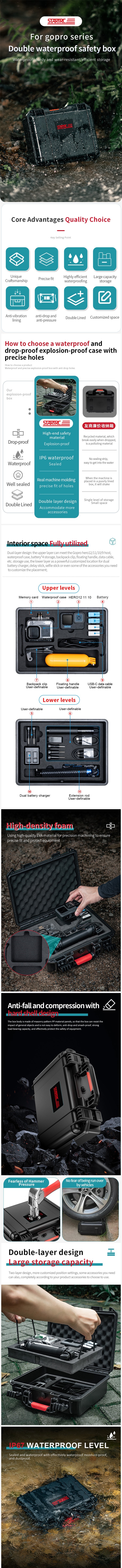 - For gopro series double waterproof safety box,choose a waterproof and drop-proof explosion-proof case with precise holes,interior space fully utilized,lower levels,high-density foam,anti-fall and compression with hard shell design;