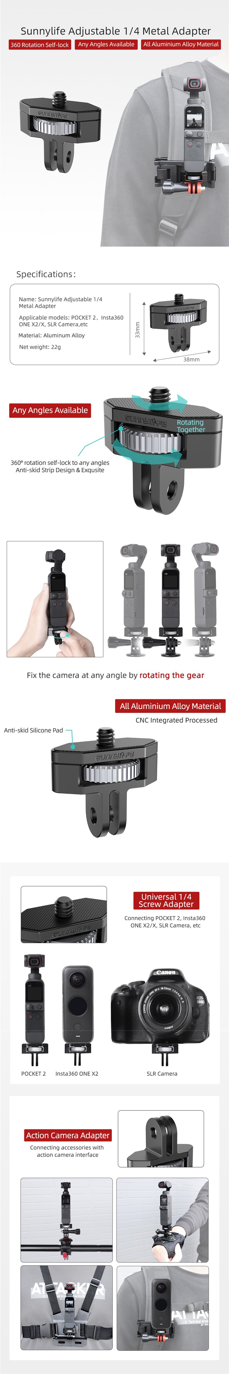 - Apply to equipment with 1/4 screw hole, like POCKET 2, Insta360 ONE X2/X, SLR Camera, etc.