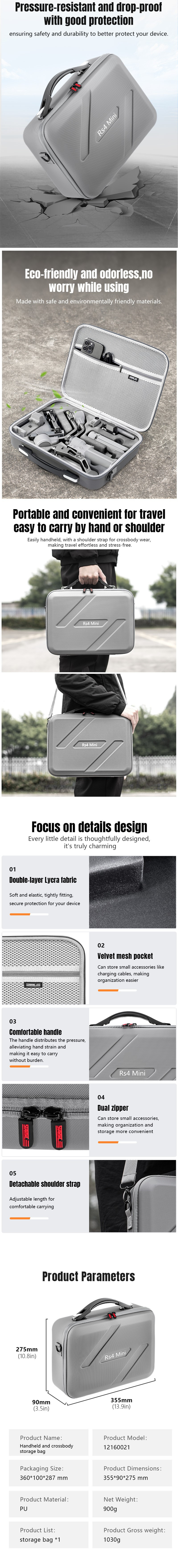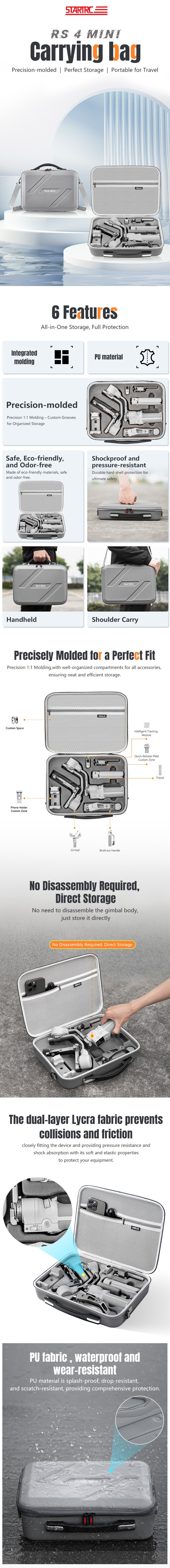 - STARTRC Carrying bag for RS 4 Mini,Precisely Molded for a Perfect Fit,No Disassembly Required,Direct Storage,The dual-layer Lycra fabric prevents collisions and friction,PU fabric , waterproof and wear-resistant,Pressure-resistant and drop-proof with good protection,Eco-friendly and odorless,no worry while using.