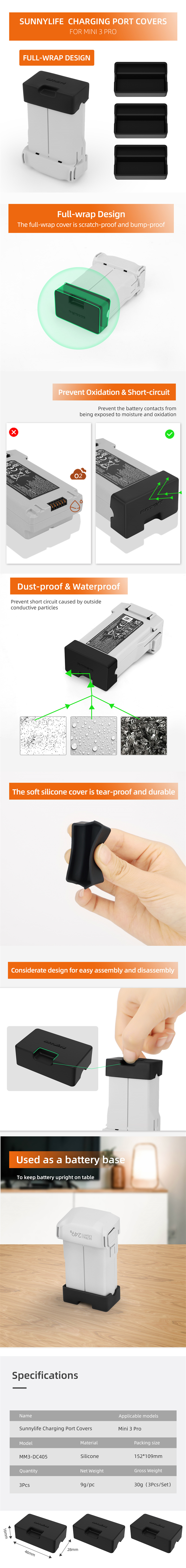 For Mini 3 Pro Battery Charging Port Plug Caps Silicone Cover 3pcs Pack Protectors Dust-proof Drone Accessories Parts Sunnylife