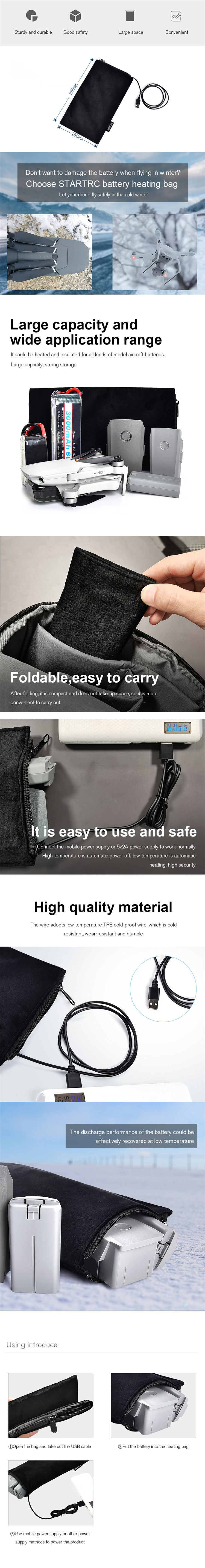 Startrrc drone battery heating bag could help to solve the serious problems, it could keep the battery at the normal temperature, reduce the internal resistance of the battery, and restore the normal discharge performance.