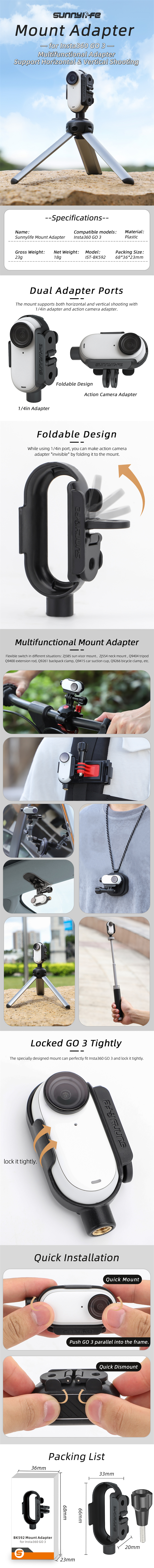 -Horizontal and vertical strokes kill two birds with one stone. It has 1/4 connector and Action camera connector, which can be used together with Sunnylife ZJ585 Sun visor bracket, ZJ554 magnetic suction neck bracket, Q9404 tripod, Q9400 extension bar, Q9261 backpack clip, Q9415 car mounted sucker, Q9266 bicycle clip, etc.