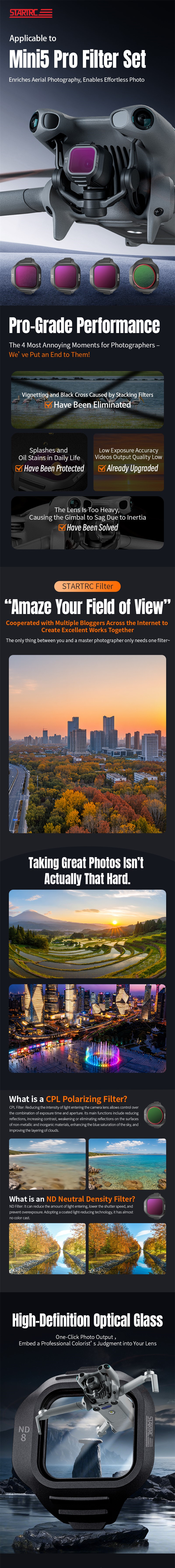 - STARTRC Applicable to Mini 5 Pro Filter Set Amazes your field of view with pro-grade, high-definition optical glass. Multi-layer coating prevents vignetting, ensures sharpness, and protects the slim, durable lens.