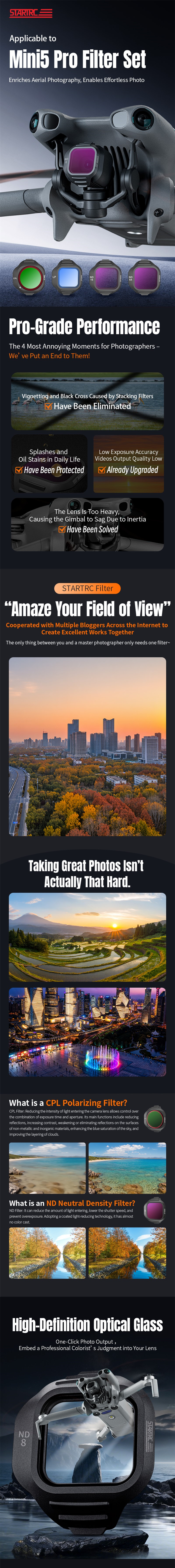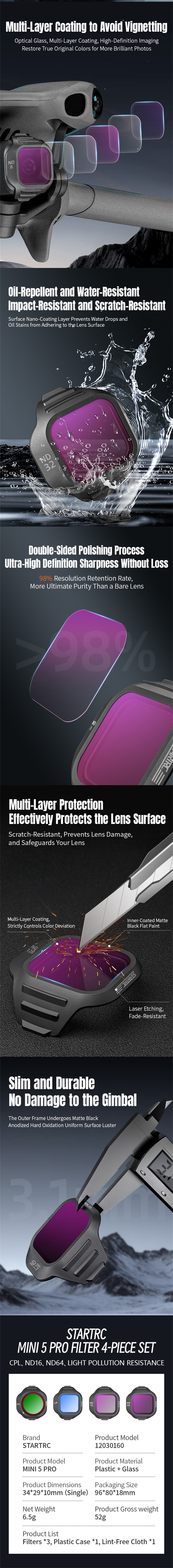 - STARTRC Applicable to Mini 5 Pro Filter Set Amazes your field of view with pro-grade, high-definition optical glass. Multi-layer coating prevents vignetting, ensures sharpness, and protects the slim, durable lens.