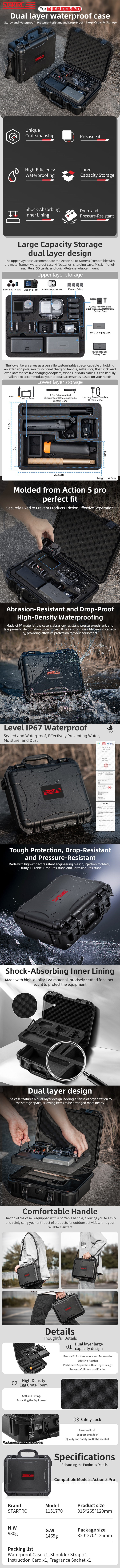 - STARTRC for DJI Action 5 Pro dual layer waterproof case,large capacity storage dual layer design,molded from Action 5 pro perfect fit,